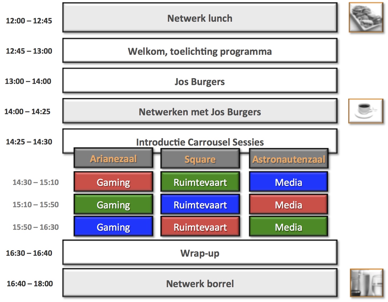 Zo'n 50 deelnemers zagen hoe Jos Burgers (www.josburgers.nl) een inzicht gaf in wat wel en niet nodig is om nieuwe markten te betreden. Vooral de metaforen: 'boren en gaten' en 'kuddegedrag van koeien in de wei' zette de toon van de rest van de middag. De deelnemers maakten in drie sessie's over ruimtevaart, media en gaming kennis met nieuwe markt mogelijkheden. Deze sessie's werden verzorgd door de TU Delft, IenM, Kinetic en NSO.
