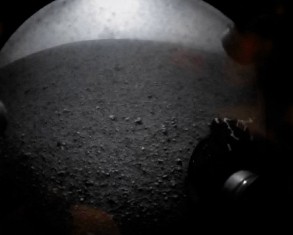 Het eerste beeld dat Curiosity vanochtend stuurde vanaf Mars genomen met een camera bij een van de wielen. Foto Reuters / NASA
