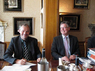Het contract voor PLuG wordt ondertekend door de heer Wim Anemaat (Directeur Techniek en Infrastructuur van Rijkswaterstaat, links op de foto) en Menno Smits (directeur Advies- en Ingenieursbureau Oranjewoud, hoofdaannemer).